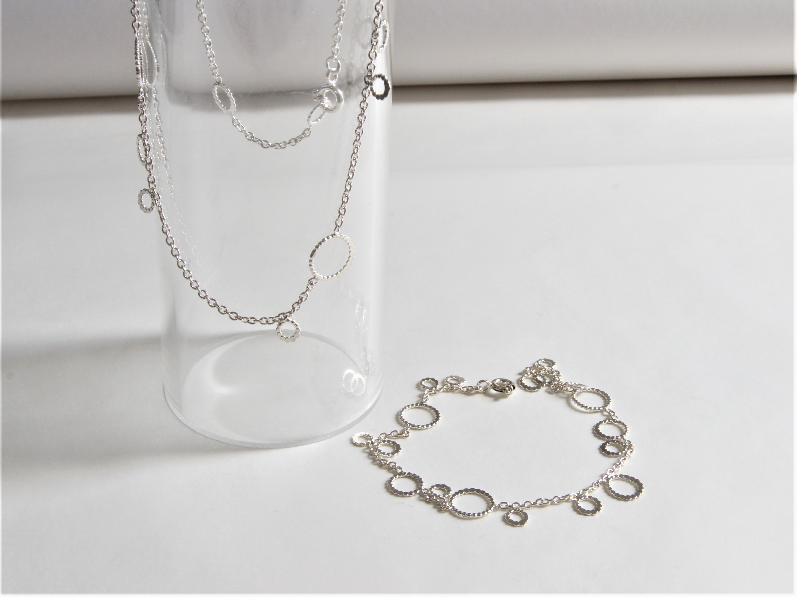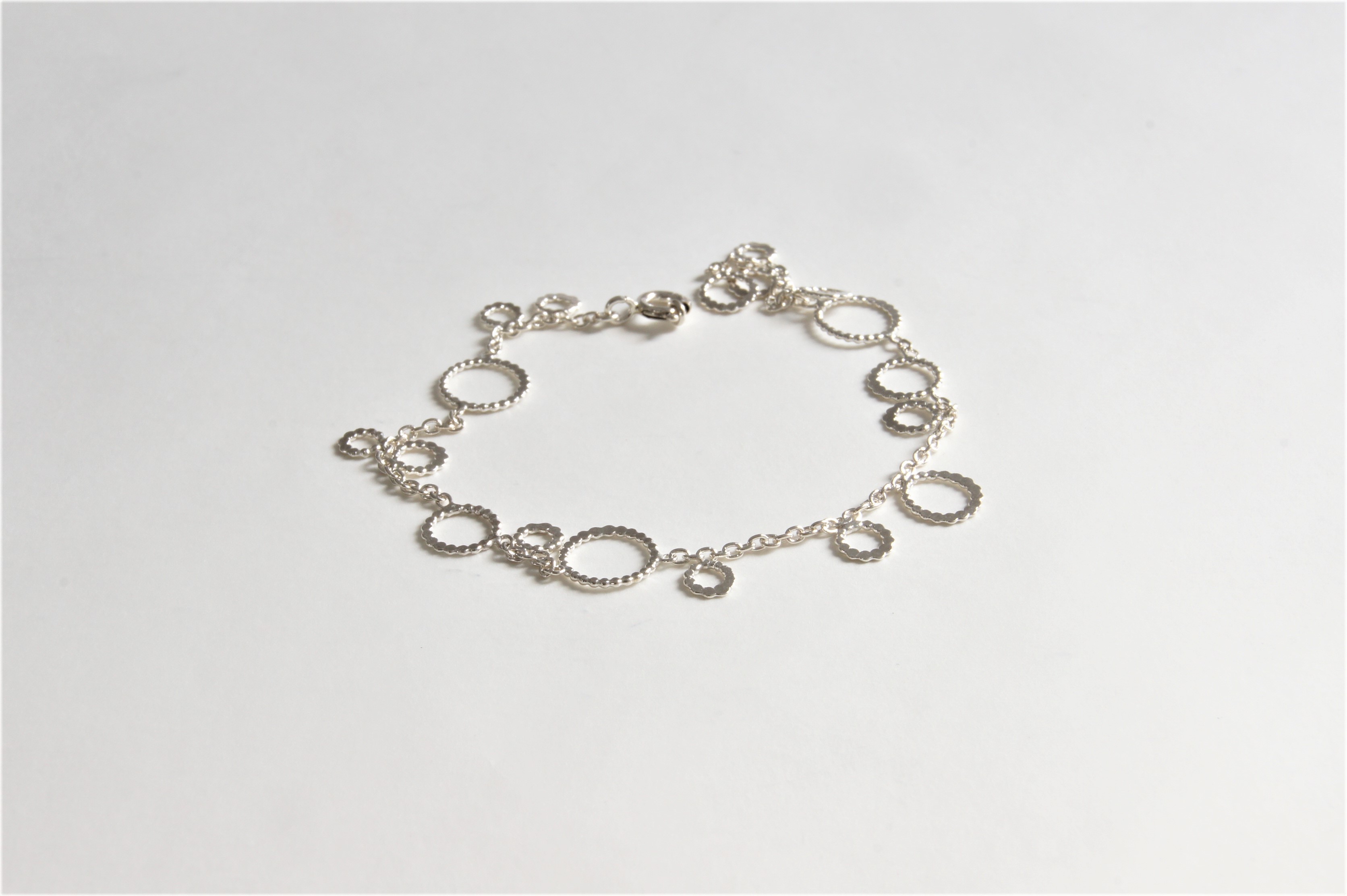 Armband zilver pareldraad. Mooi gerangschikte schakels van zilver pareldraad aan zilver armbandje.