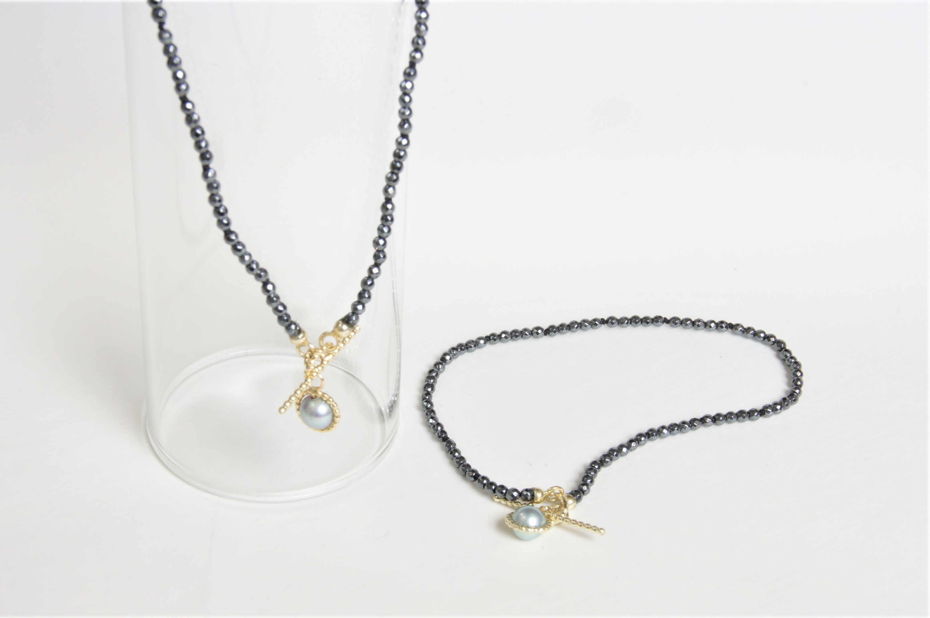 armbandje hematiet en parel. Met gouden slotje.