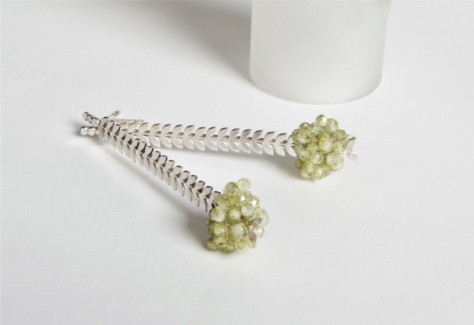 2. zilver takje met blaadjes, waaraan trosje lime groene zirkonia